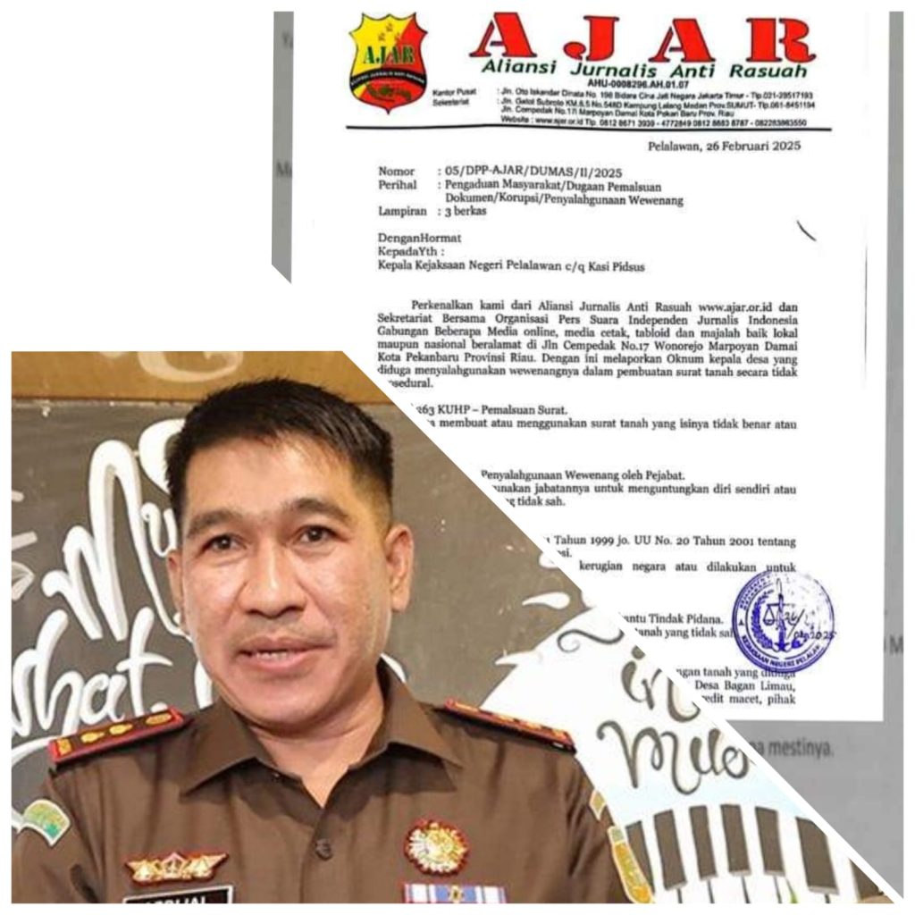 AJAR (Aliansi Jurnalis Anti Rasuah) bersama organisasi pers telah resmi melayangkan laporan pengaduan kepada Kejaksaan Negeri (Kejari) Pelalawan terkait dugaan pemalsuan surat, penyalahgunaan wewenang, dan tindak pidana korupsi yang melibatkan oknum Kepala Desa Bagan Limau, Dugaan kuat menunjukkan bahwa aparat desa memanipulasi dokumen tanah demi keuntungan pribadi dan kelompoknya, sehingga merugikan masyarakat serta menyebabkan potensi kerugian negara.