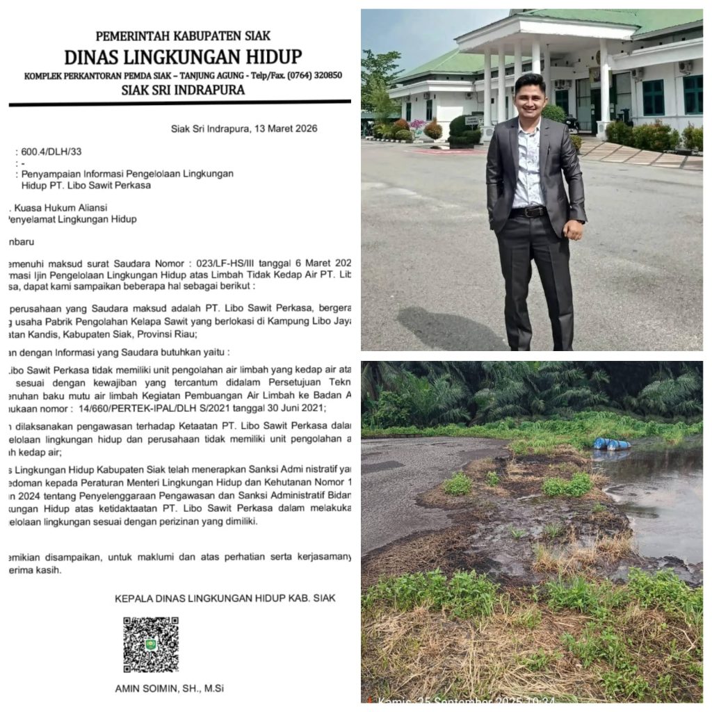 ”Benar Dinas Lingkungan Hidup Kabupaten Siak telah menegaskan bahwa benar perusahaan tidak memiliki unit pengolahan air limbah yang kedap air . Atas temuan tersebut, pihak dinas juga telah menjatuhkan sanksi administrasi kepada PT Libo Sawit Perkasa,” ujar Syamsul Arif dalam keterangannya.
