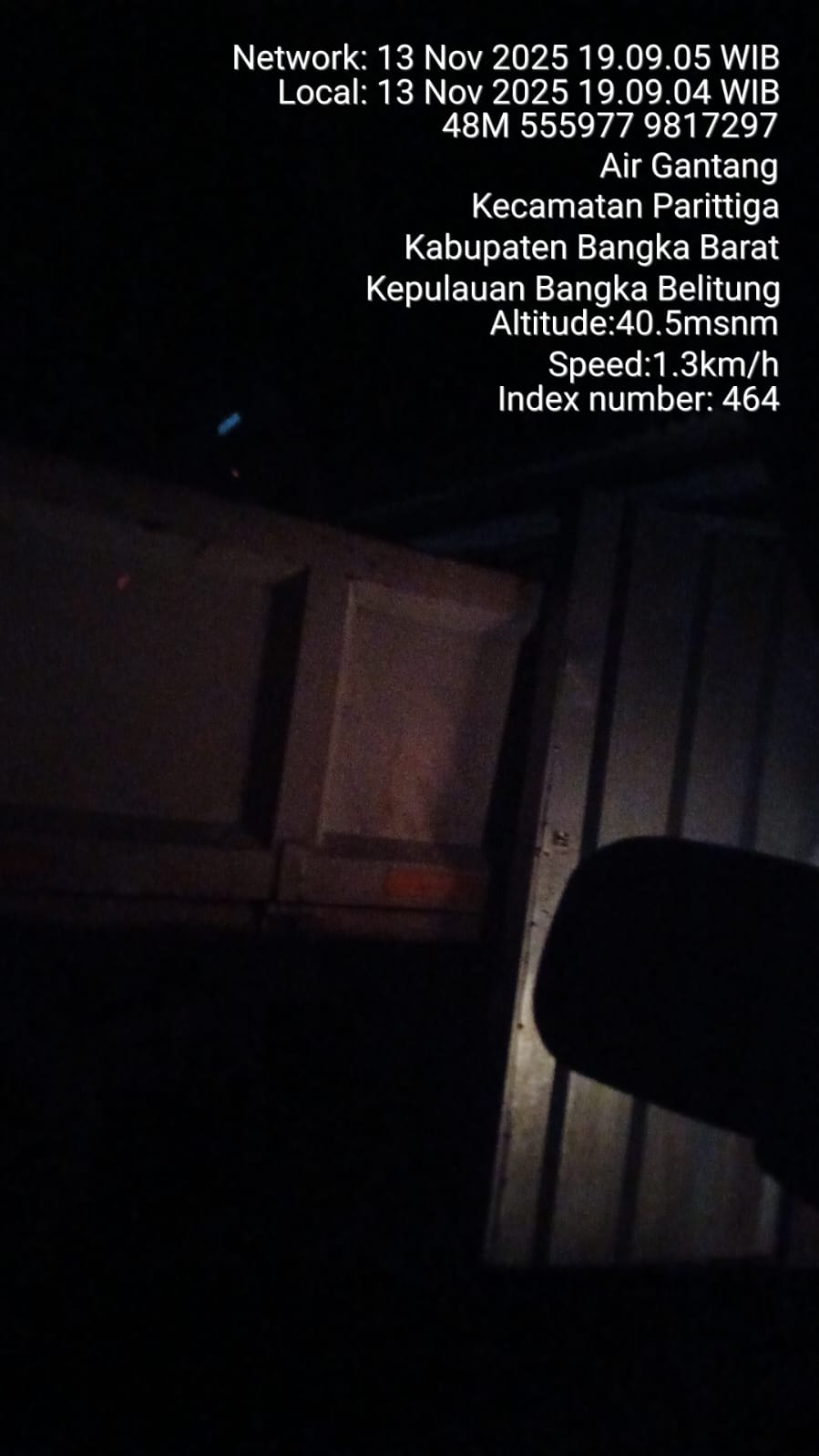 Buser24jam.com – Parit Tiga Bangka Barat, Kabar terbaru ditemukan gudang penampungan pasir timah ilegal terletak di Desa Air Gantang Kampung Suntai Kecamatan Parit Tiga Kabupaten Bangka Barat Provinsi Kepulauan Bangka Belitung, Kamis 13/11/25 sekira pukul 19.09 Wib.