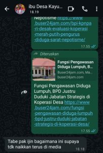 Menariknya, setelah pemberitaan mengenai dugaan konflik kepentingan ini mulai beredar, Kepala Desa Kayu Calla disebut memberikan respons melalui pesan aplikasi WhatsApp. Dalam pesan tersebut, ia menyampaikan agar pemberitaan dihentikan.