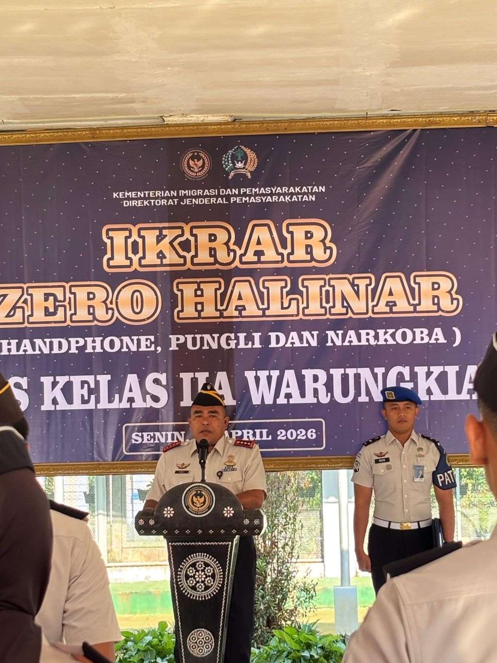 Kegiatan yang dilaksanakan Selasa (20/4/2026) di lingkungan Lapas Kelas IIA Warungkiara ini diikuti dengan penuh khidmat oleh seluruh petugas. Ikrar tersebut menjadi wujud nyata tekad bersama dalam memberantas segala bentuk pelanggaran, khususnya peredaran handphone ilegal, praktik pungutan liar, dan penyalahgunaan narkoba di dalam lapas.