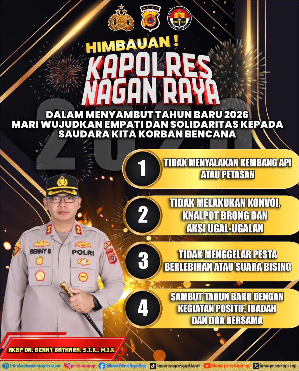 Menyambut pergantian Tahun Baru 2026, Kapolres Nagan Raya AKBP Dr. Benny Bathara, S.I.K., M.I.K. mengimbau seluruh masyarakat Kabupaten Nagan Raya untuk merayakan malam tahun baru dengan penuh empati, solidaritas, dan kepedulian, khususnya kepada saudara-saudara yang terdampak bencana.