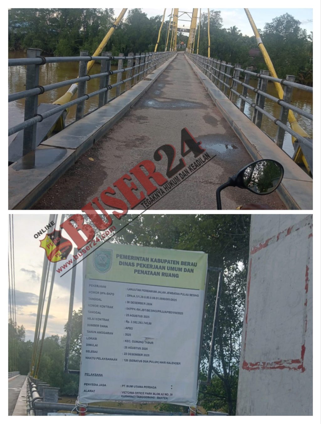 buser24jam.com | Berau – Kalimantan Timur-Lembaga Swadaya Masyarakat (LSM) antikorupsi menyoroti proyek lanjutan perbaikan jembatan gantung di Kampung Pulau Besing, Kecamatan Gunung Tabur, Kabupaten Berau, yang menelan anggaran miliaran rupiah. Proyek tersebut diduga tidak menunjukkan perubahan signifikan di lapangan dan disinyalir tidak sesuai dengan Rencana Anggaran Biaya (RAB) pekerjaan.