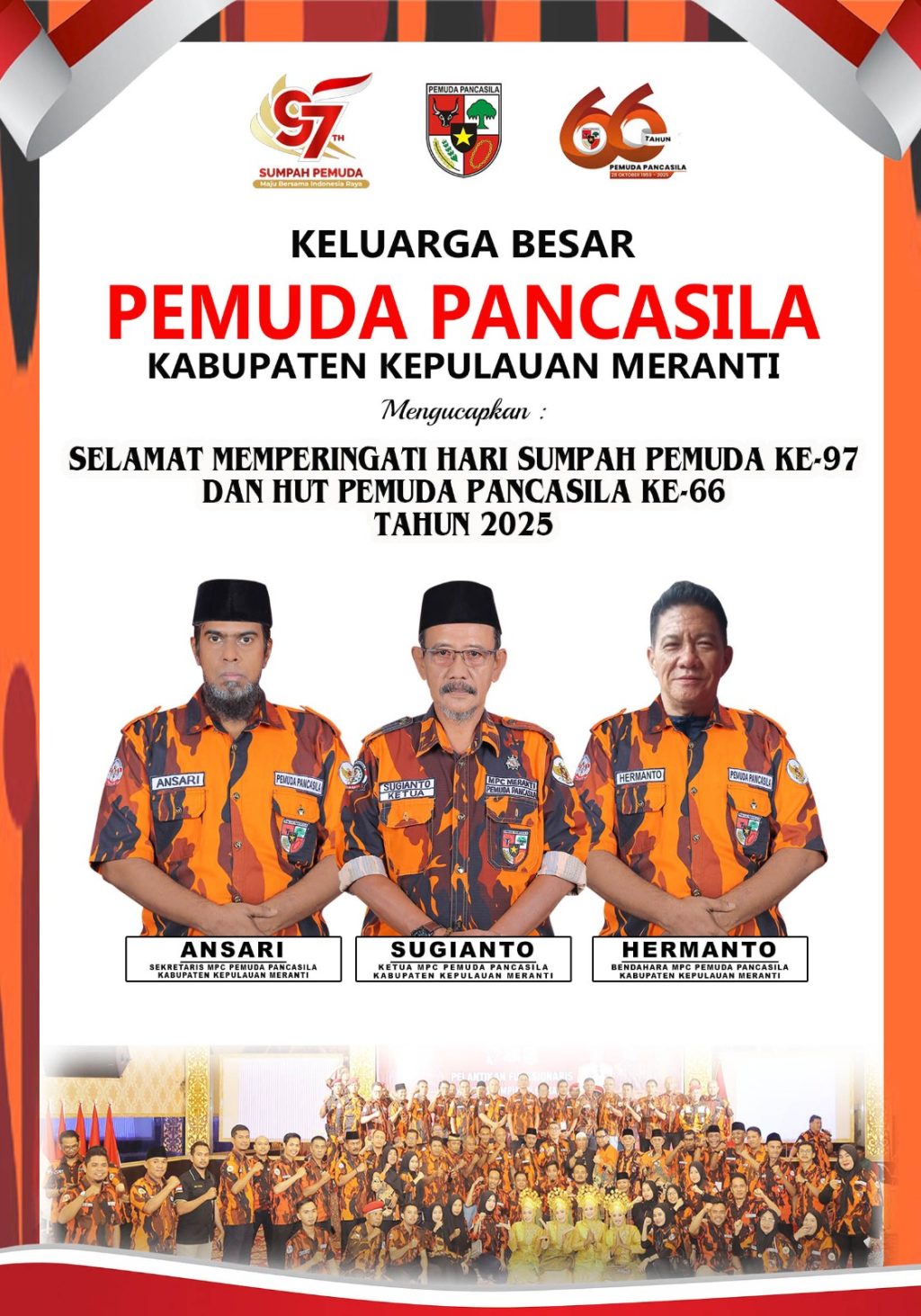 Dengan tema “Majukan Indonesia, Bersatu dalam Karya”, peringatan Hari Sumpah Pemuda ke-97 dan HUT Pemuda Pancasila ke-66 tahun ini menjadi simbol semangat kebersamaan, pengabdian, dan komitmen organisasi dalam membangun Kepulauan Meranti yang lebih baik.(Is)
