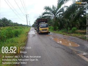 Buser24jam.com,Ogan ilir -:Tanjung Pule, Indralaya Utara, Ogan Ilir – 22 Desember 2025 – Kekecewaan warga Tanjung Pule membanjiri! Jalan Arwana 1 No 1 yang baru saja diaspal beberapa bulan lalu dengan dana dari uang negara, kini makin rusak parah – dan yang dipercaya memperparah kerusakan adalah truk pengangkut Tandan Buah Sawit (TBS) bertonase puluhan ton yang menuju PT Indarlaya Argo Lestari (IAL).