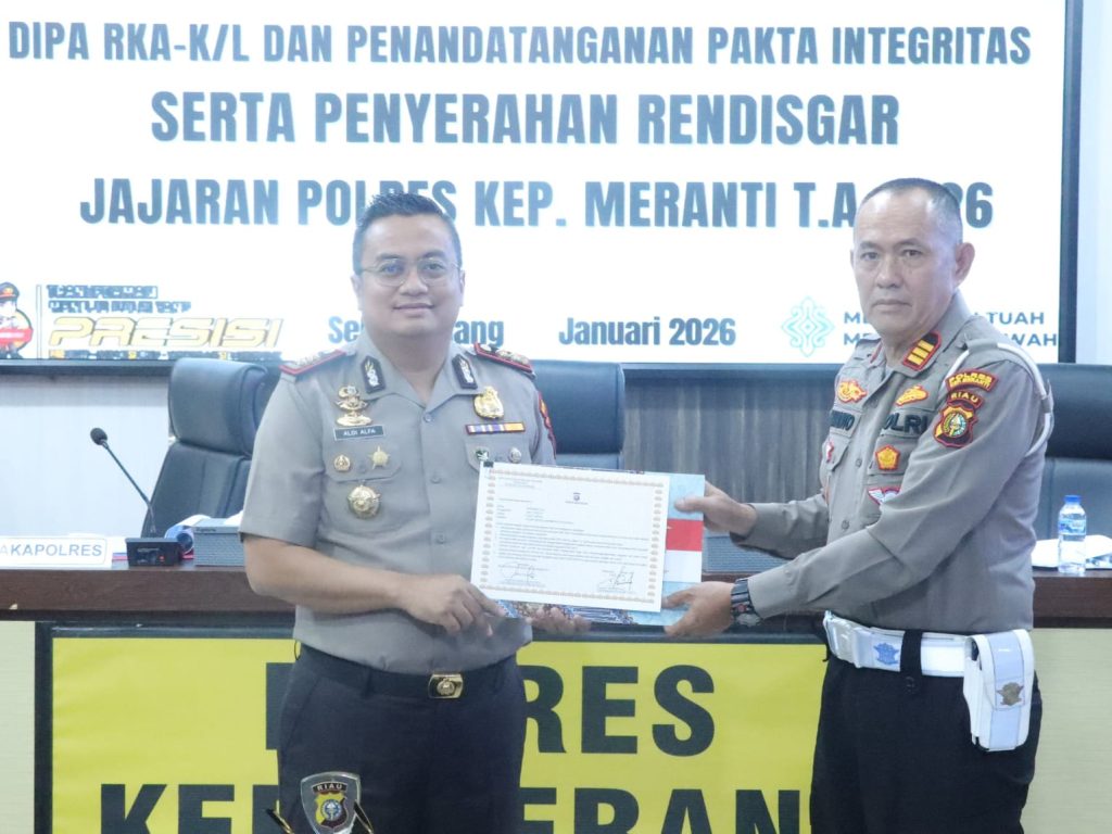 Buser24jam. Meranti,- Polres Kepulauan Meranti menggelar kegiatan Sosialisasi DIPA RKA-KL Tahun Anggaran 2026, Penandatanganan Fakta Integritas, serta Penyerahan Rencana Distribusi Anggaran (Rendisgar) kepada seluruh jajaran, Senin (19/1/2026).