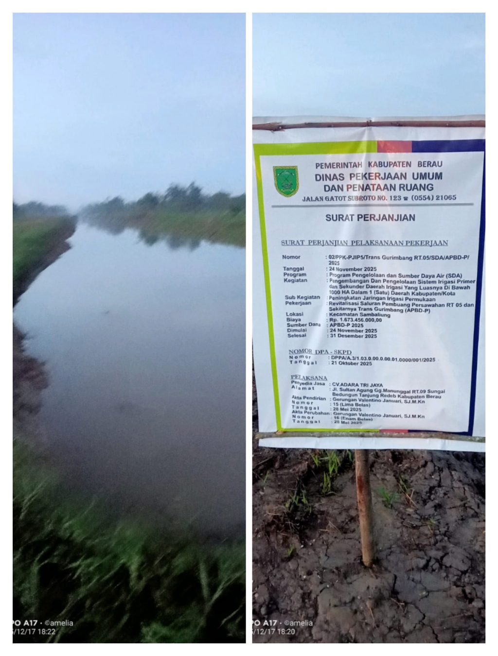 Dari papan informasi proyek yang terpasang di lokasi, diketahui proyek tersebut merupakan kegiatan Rehabilitasi Saluran Pembawa Persawahan RT 05 dan Sekitarnya Trans Gurimbang, yang berada di bawah Dinas Pekerjaan Umum dan Penataan Ruang (PUPR) Kabupaten Berau. Proyek ini bersumber dari APBD-P Tahun Anggaran 2025 dengan nilai anggaran sebesar Rp1.673.456.000,00 dan dikerjakan oleh CV. Adara Tri Jaya, dengan masa pelaksanaan mulai 24 November hingga 31 Desember 2025.