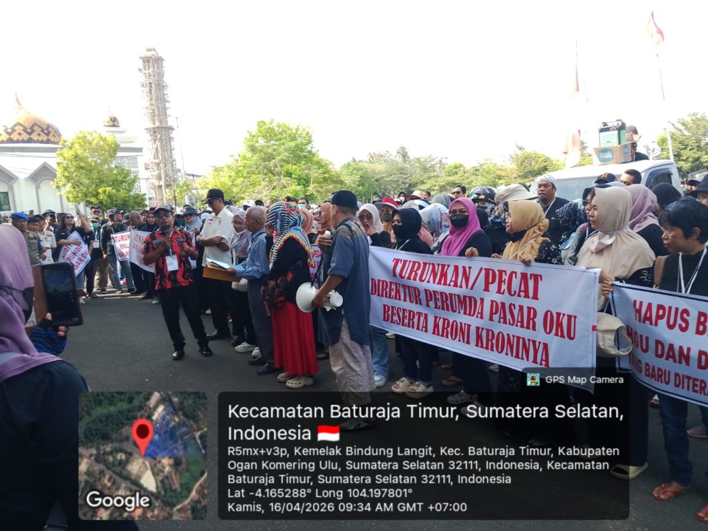 Buser24jam. Baturaja, OKU – Ratusan pedagang menggelar aksi damai di Kantor Pemerintah Kabupaten Ogan Komering Ulu (OKU), Kamis (16/4/2026). Mereka menuntut pencopotan jajaran direksi Perumda Pasar serta pengusutan dugaan korupsi dalam pengelolaan pasar.