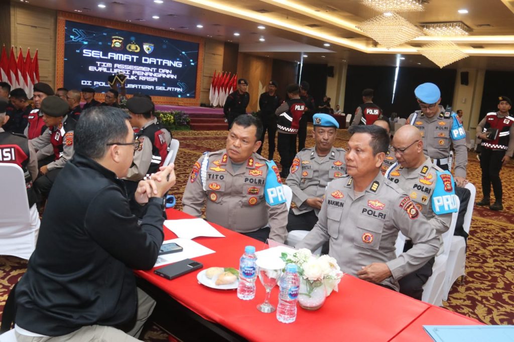 Buser24jam.com,Palembang,– Kepolisian Daerah Sumatera Selatan (Polda Sumsel) menerima kunjungan Tim Terpadu Assesment dan evaluasi penanganan unjuk rasa diwilayah Hukum Polda Sumsel yang dipimpin Brigjen Pol Fadhilah Zulkarnain,SIK dan Kombes Pol Sika Hardianto,SH,SIK,MH beserta Tim Terpadu Assesment dan evaluasi penanganan unjuk rasa pada Kamis (18/9/2025) siang. Rombongan diterima langsung oleh Kapolda Sumsel Irjen Pol Andi Rian R Djajadi SIK MH diwakili Irwasda Kombes Pol Feri Handoko Soenarso SH SIK beserta para Pejabat Utama (PJU) Polda Sumsel dalam sebuah pertemuan di ruang Vidcon lantai 2 Gedung Utama Presisi Mapolda Sumsel Jalan Jenderal Sudirman Palembang